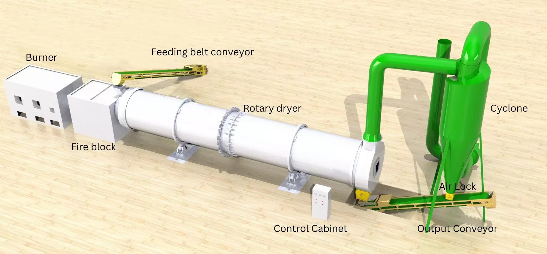 - Sau khi nguyên liệu được sấy khô, nó sẽ được xả ra ngoài thông qua băng tải hoặc cửa xả.